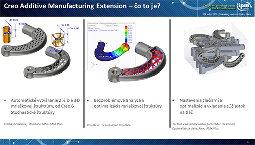 Prínosy 3D tlače, Creo Additive Manufacturing – čo to je?, Porovnanie licencií, Lattice – nové možnosti tvorby geometrie, Build Direction –smer tvorby súčiastky. Nový formát súboru pre 3D tlač – 3MF, Podpora 3D tlačiarní, 3D tlač - Creo AMX Plus, Creo Topology Optimization, Zhrnutie. |
