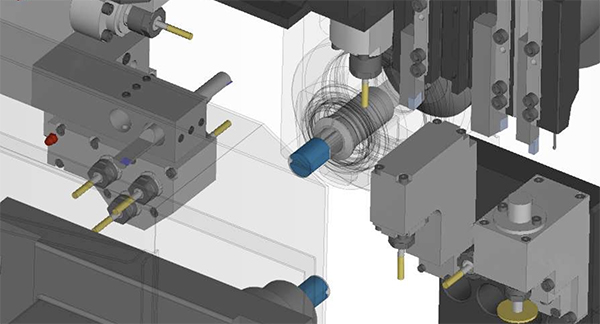 - simulácia v reálnom čase vizualizuje celý pohyb stroja, vrátane odovzdávania sekundárnemu vretenu