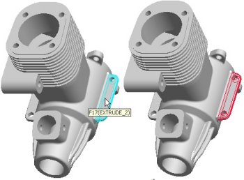 Move the mouse over a feature to highlight it. Click the left mouse button to make a selection. Cyan (light blue) highlighting indicates an item is pre-selected. Red highlighting indicates an item is selected. Once a feature is selected, edges or surfaces of the feature will highlight, and could be selected. |