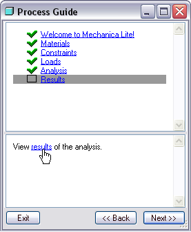 (Next >>) a kliknite na výsledky (results) v okne Procesný Sprievodca (Process