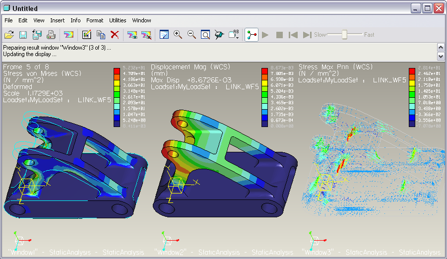 rozdelené do troch okien: animované Von Mises napätia, Posunutia