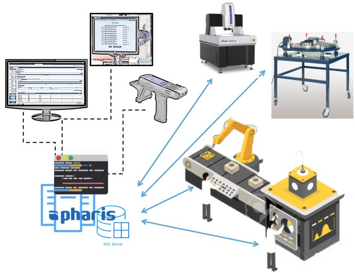 Pre priame pripojenie kontrolných staníc k MES PHARIS® je možné zvyčajne využiť sériovú alebo USB komunikáciu, analógové karty, proprietárne protokoly výrobcov zariadení a pod.