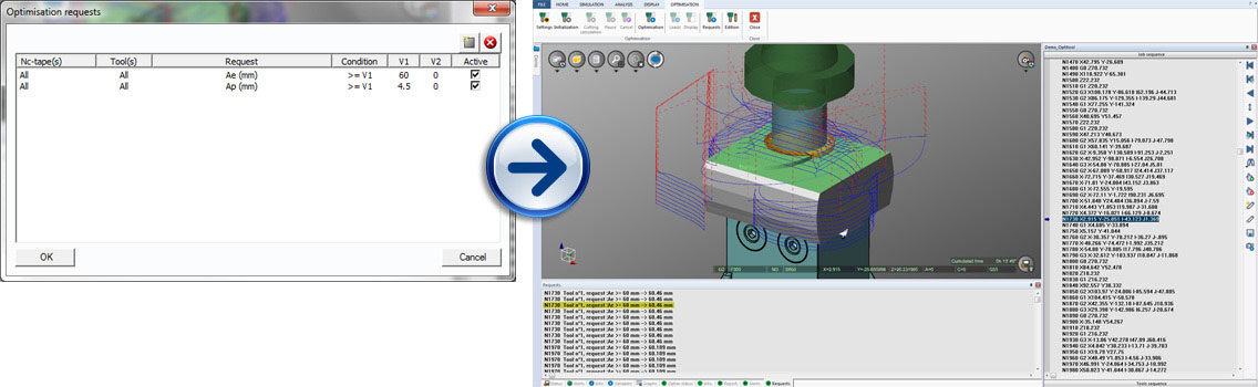 NCSIMUL Optitool je modulom NCSIMUL Machine, ktorý umožňuje optimalizovať dĺžky nástrojov, obrábanie vzduchu a rezné podmienky vašich NC programov.