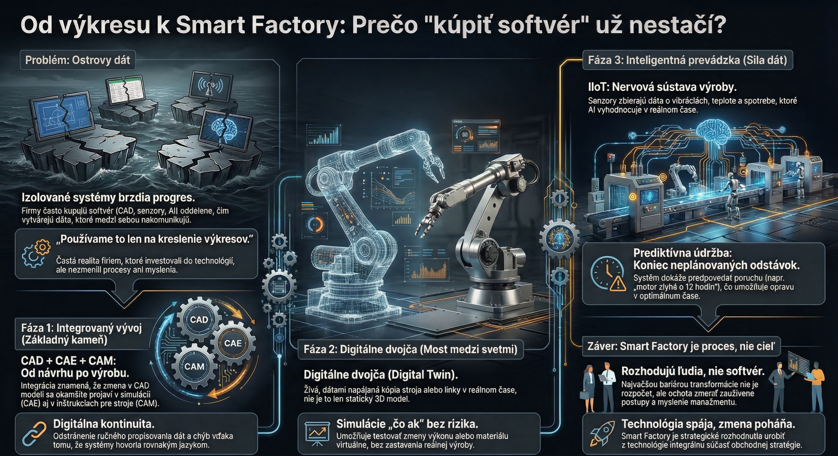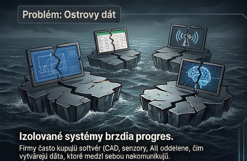 Dnes sa veľa hovorí o Industry 4.0, o digitálnom dvojčati, o AI. Často to však vidím tak, že firmy riešia veci izolovane. Najskôr CAD, potom nejaké senzory, potom projekt s AI. Každé oddelenie má svoje dáta, svoje nástroje, svoje ciele. Namiesto prepojeného systému vzniknú oddelené ostrovy, ktoré spolu veľmi nekomunikujú.