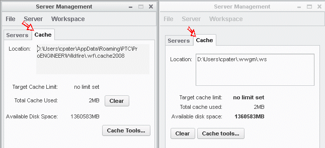 - Všimnite si, že záložka Vyrovnávacia pamäť(Cache) v okne Správa serverov(Server Management) zobrazuje cestu na adresár vyrovnávacej pamäte a všetky adresáre uvedené vyššie by mali byť premenované alebo vymazané, ak existujú: