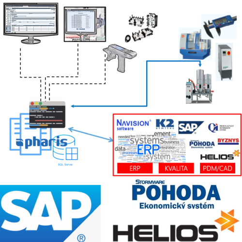 V digitálne riadenom výrobnom procese je veľmi dôležité mať uzavretú sľučku medzi MES a ERP systémami. MES PHARIS® a jeho štandardizované komunikačné rozhranie umožňuje efektívne napojenie ERP systému a to pomocou dvoch typov pripojení. Prvým je špecifické štandardizované rozhranie pre pripojenie SAP. Druhým je štandardizované rozhranie pre ostatných výrobcov ERP. PHARIS je napojený na širokú škálu ERP systémov, medzi ktoré patrí napr. HELIOS, QI, K2, OR-SYSTEM, NAVISION, ENTRY, DIALÓG 3000, BYZNYS, ES POHODA ...