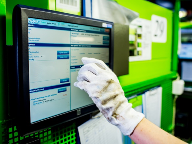 Pre odvody práce sú jednotlivé pracoviská lisovne/vstrekovne vybavené výrobnými terminálmi. Operátor potvrdí systémom napočítané kusy, ktoré sú automaticky on-line odvádzané aj do ERP systému.