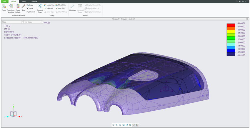Po vytvorení súčiastky je možné použiť modul Simulate integrovaný do Composite Designu. Keď vytvárame simuláciu tak vlastnosti laminátu ako obrysy materiálov, sekvencie skladania, definované vlastnosti materiálov sú automaticky načítané v Creo Simulate.