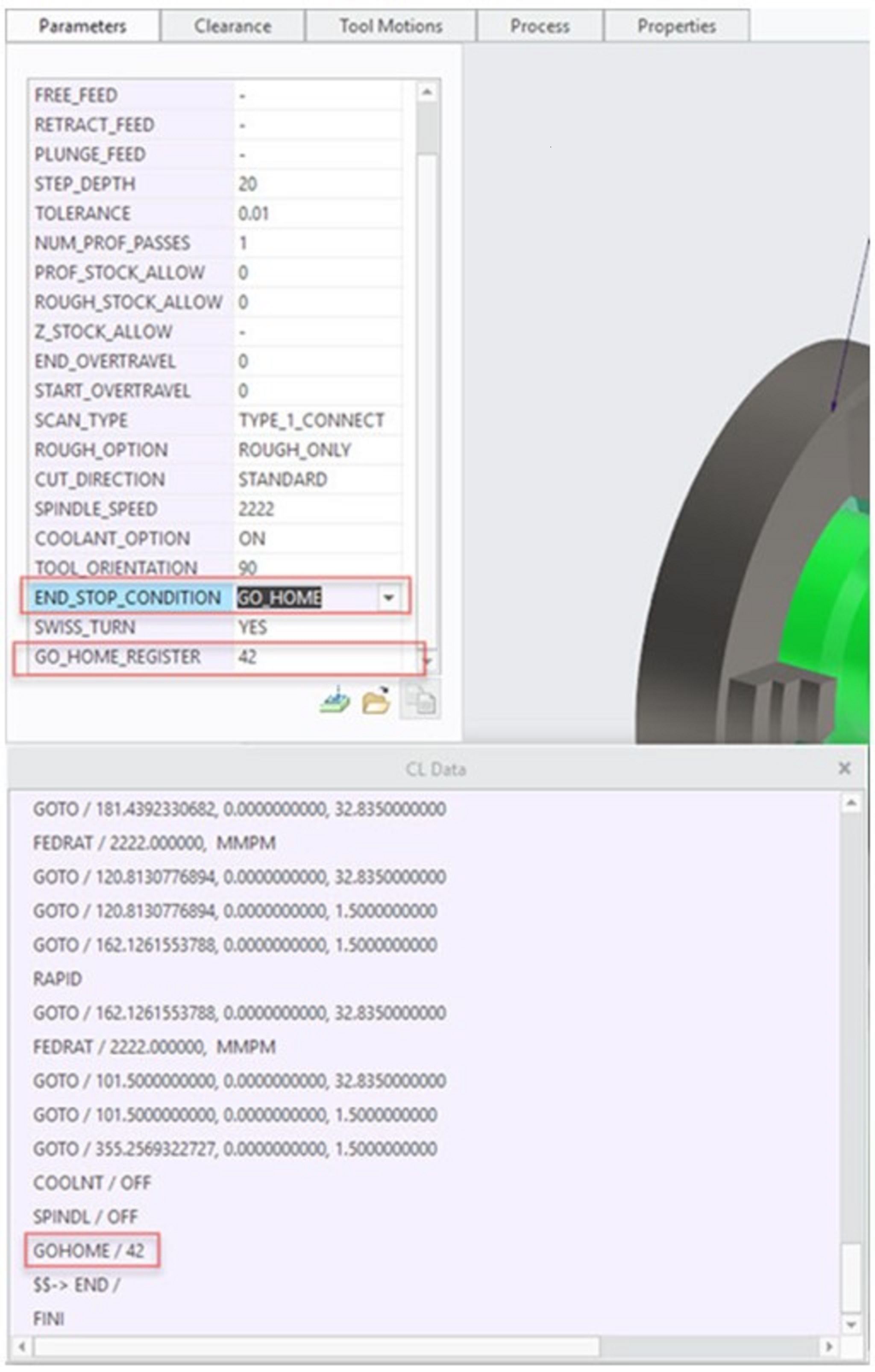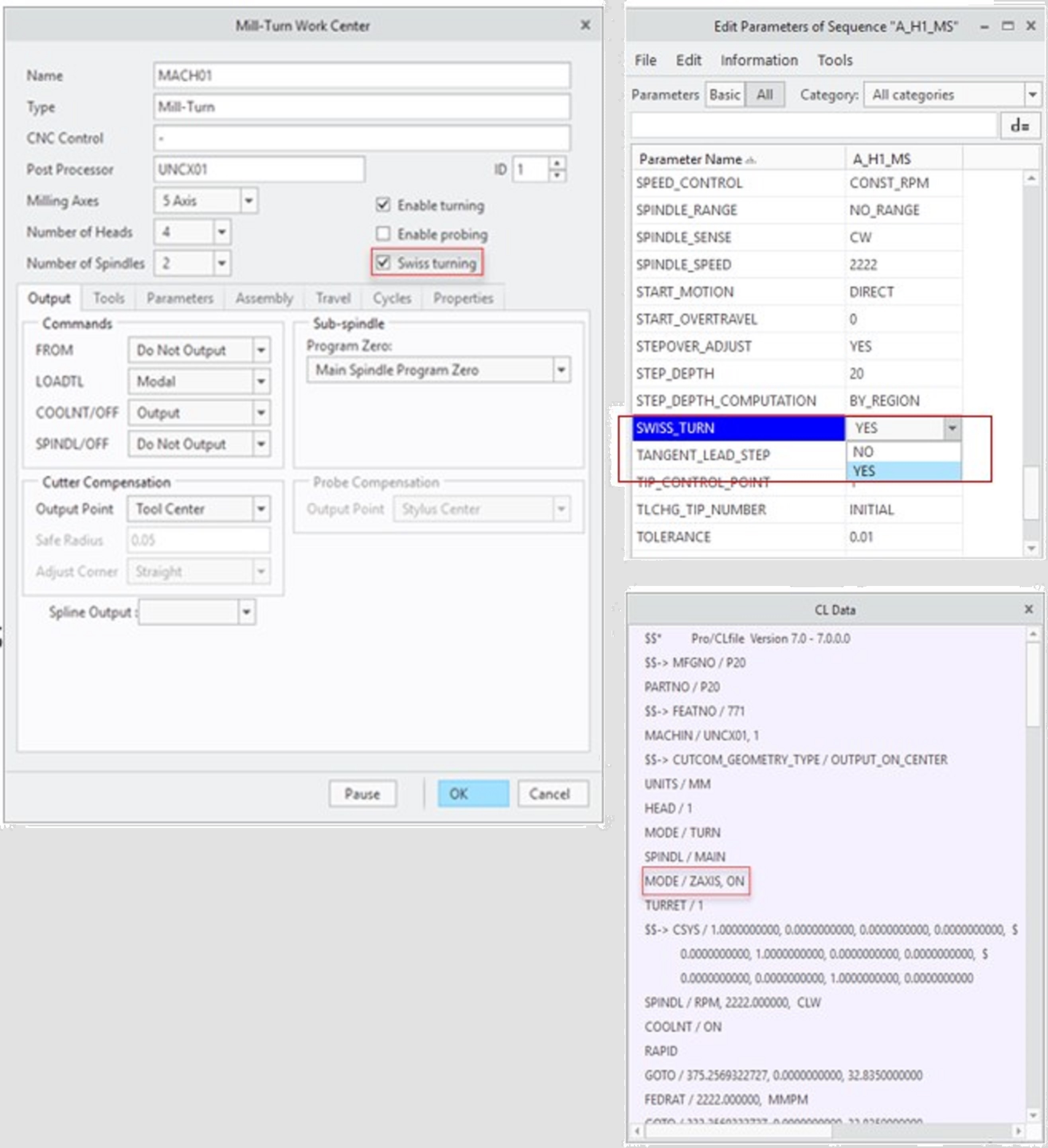 Ak vyberiete toto začiarkavacie políčko a zadefinujete dráhu nástroja, môžete teraz nastaviť parameter SWISS_TURN na YES, aby ste do CL dát pridali riadok, ktorý bude čítať MODE / ZAXIS, ON.