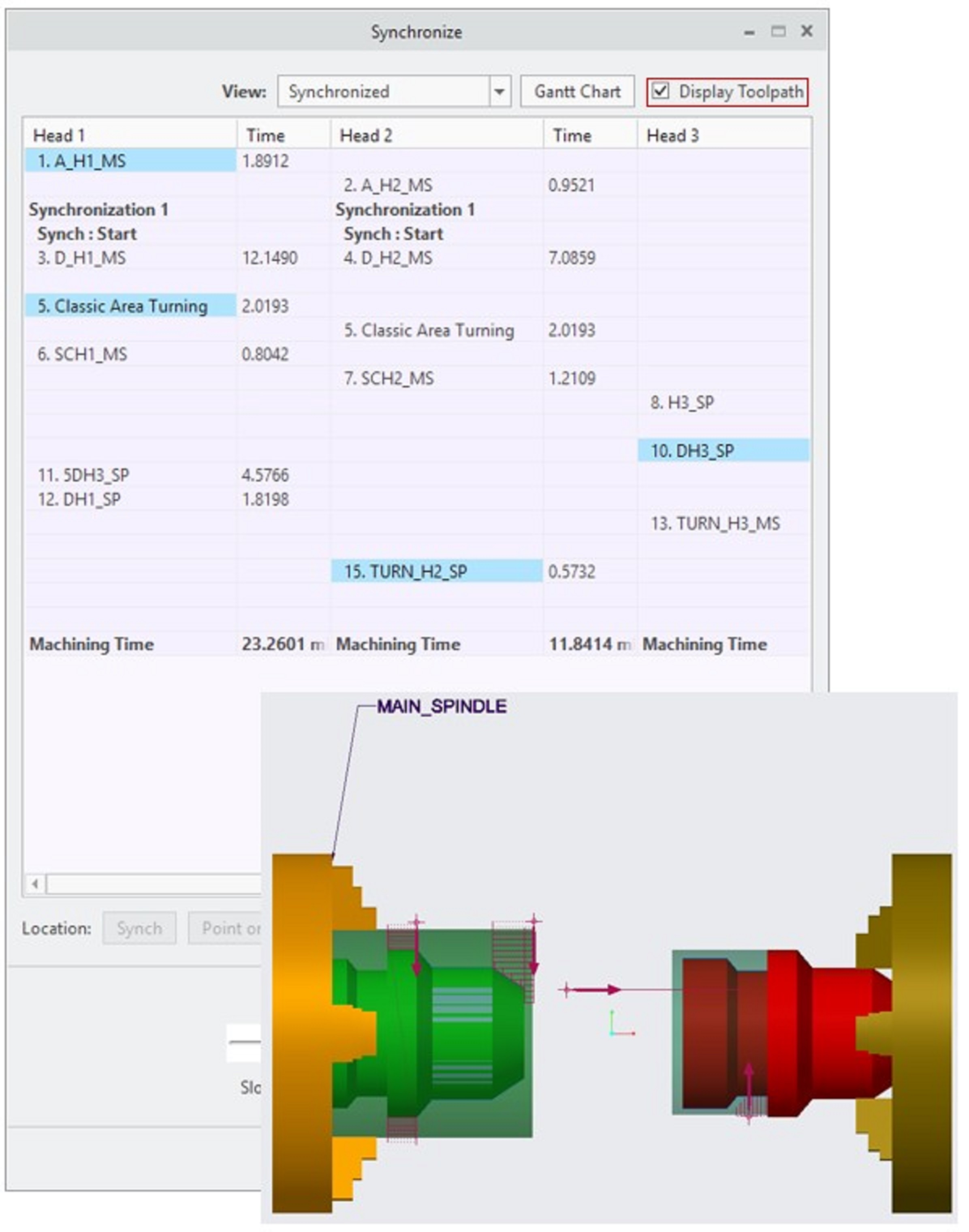 V predchádzajúcich verziách musel užívateľ pri vytváraní synchronizačných sekvencií pre multifunkčné stroje pamätať na to, ktoré dráhy nástrojov sa budú synchronizovať. V Creo Parametric 7.0.0.0 je možné vidieť synchronizované dráhy nástroja aj v grafickej oblasti, zatiaľ čo ich vidno v užívateľskom rozhraní synchronizácie.