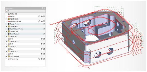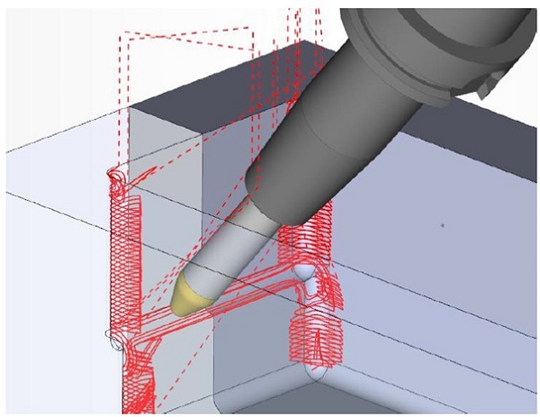 5-osé opracovanie bolo pridané do Esprit Edge 2024.1 a ponúklo automatizované riešenie na odstraňovanie zvyškového materiálu v rohoch, ktoré dopĺňa hlavné 5-osé dokončovacie operácie. Cyklus pokračuje vo svojom vývoji s možnosťou použiť rôzne dráhy obrábania v strmých a plytkých oblastiach: Použite stratégiu Z-level pre strmé rohy a zmeňte prechody na sústredné pre plytké rohy. Kombináciou rôznych tvarov dráh systém vytvára efektívnejšiu dráhu nástroja, ktorá zabraňuje nadmernému záberu rezného nástroja.