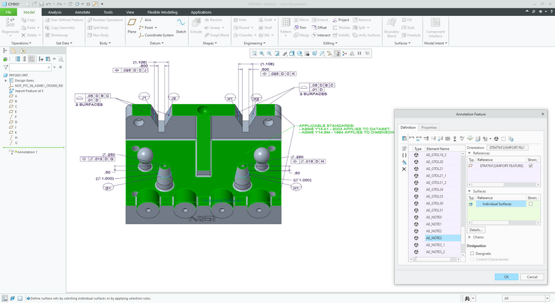 Creo Vám poskytuje výkonné nástroje MBD, ktoré poskytujú väčšiu prehľadnosť s menšou potrebou exportu dát. Symboly používané pre definovanie MBD sú teraz v úplnom súlade s najnovšími normami ASME/ ISO a poskytujú viac informácií následným používateľom. Nové symboly zvarov a vytváranie šrafovacích vzorov uľahčujú vytváranie detailov. Tu je bližší popis :